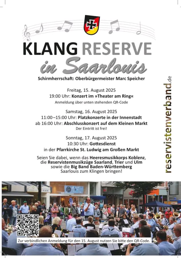 Vom 15. bis 17. August 2025 verwandelt sich Saarlouis in eine Bühne für ein außergewöhnliches Musikfestival: Die KlangReserve 2025 bringt Reservistenmusikzüge aus dem Saarland, Rheinland-Pfalz und Baden-Württemberg in die Stadt. Ob feierliches Eröffnungskonzert, stimmungsvolle Platzkonzerte oder ein musikalischer Gottesdienst zum Abschluss – Musik verbindet und öffnet Türen. Organisiert vom Reservistenverband und unterstützt von der Bundeswehr zeigt das Festival: Die Reserve ist Teil der Gesellschaft – bürgernah, engagiert und vielfältig. Teilnehmende Musikformationen sind das Heeresmusikkorps Koblenz, die Reservistenmusikzüge Saarland, Trier & Ulm sowie die Big Band Baden-Württemberg.