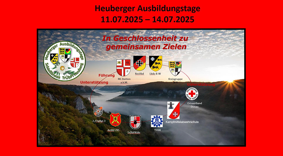 Albkaserne in Stetten am kalten Markt Hardtstraße 58, 72510 Stettem am kalten Markt, Baden-WürttembergTHEMA: Gefechtsdienst aller Truppen zu Lande Schießen im Gelände auf unterschiedliche Entfernungen Schießen MG3/5, G36, GraPi, PzFst 3 Selbst- und Kameradenhilfe (Maßnahmen am Unfallort) Zivil Militärische Zusammenarbeit mit THW C-IED Personen- u. Kfz-Kontrolle VERANSTALTUNGSFORM Dienstliche Veranstaltung TEILNEHMERKREIS Reservisten der Landesgruppe Baden-Württemberg sowie aus benachbarten Landesgruppen. Aktive Kameradinnen und Kameraden. ZEITEN Freitag 11.07.2025 08:00 Uhr Anreise Funktionspersonal, Vorbereitung der Ausbildungsstationen, Waffenempfang, Vorbereiten der Aufnahme der Hauptkräfte etc. 14:00 Uhr Beginn Aufnahme und Einschleusung der Hauptkräfte sowie Beziehen der Unterkunft. 18:30 Uhr Start der Ausbildung. Dabei Einweisung in den Ablauf, Grundsatzunterrichte sowie die Durführung der entsprechenden Belehrungen. Samstag 12.07.2025 05:00 Uhr Wecken, Körperpflege, [...]